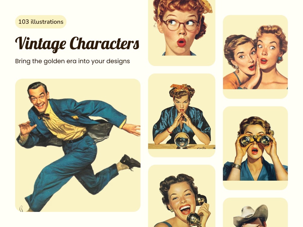 Step back in time with this collection of vintage-inspired illustrations designed to add warmth, personality, and storytelling flair to your projects. Perfect for websites, apps, blogs, and collages — each character and scene captures the nostalgic spirit of the golden era while fitting seamlessly into today’s clean, digital aesthetics. Use them to bring emotion and authenticity to landing pages, hero sections, product showcases, or social visuals. Ideal for designers, creators, and brands who want to stand out with a touch of timeless style.